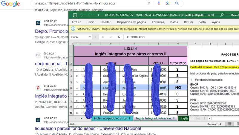 например: site:.ac.cr filetype:xlsx Cédula "2022..2023" -Formulario -Hoja1 -ucr.ac.cr